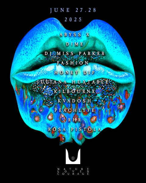 In 2025 Nature Loves Courage invited CDMX-based Colombian selector and cultural architect Rosa Pistola, all-encompassing NYC-Berlin designer diva FASHION, playful provocateur peachlyfe, Brooklyn-based deep digging dance historian DJ Miss Parker, reflective São Paulo rhythmic transformer RHR, Jamaican-American dance allure DIME, sensorial shapeshifting DJ-rapper Honey Dip and Athens-based heavy-hitting folk experimentalist kvadosh. Resident DJs Juliana Huxtable, Kilbourne and Abyss X joined once again for our extended family affair.