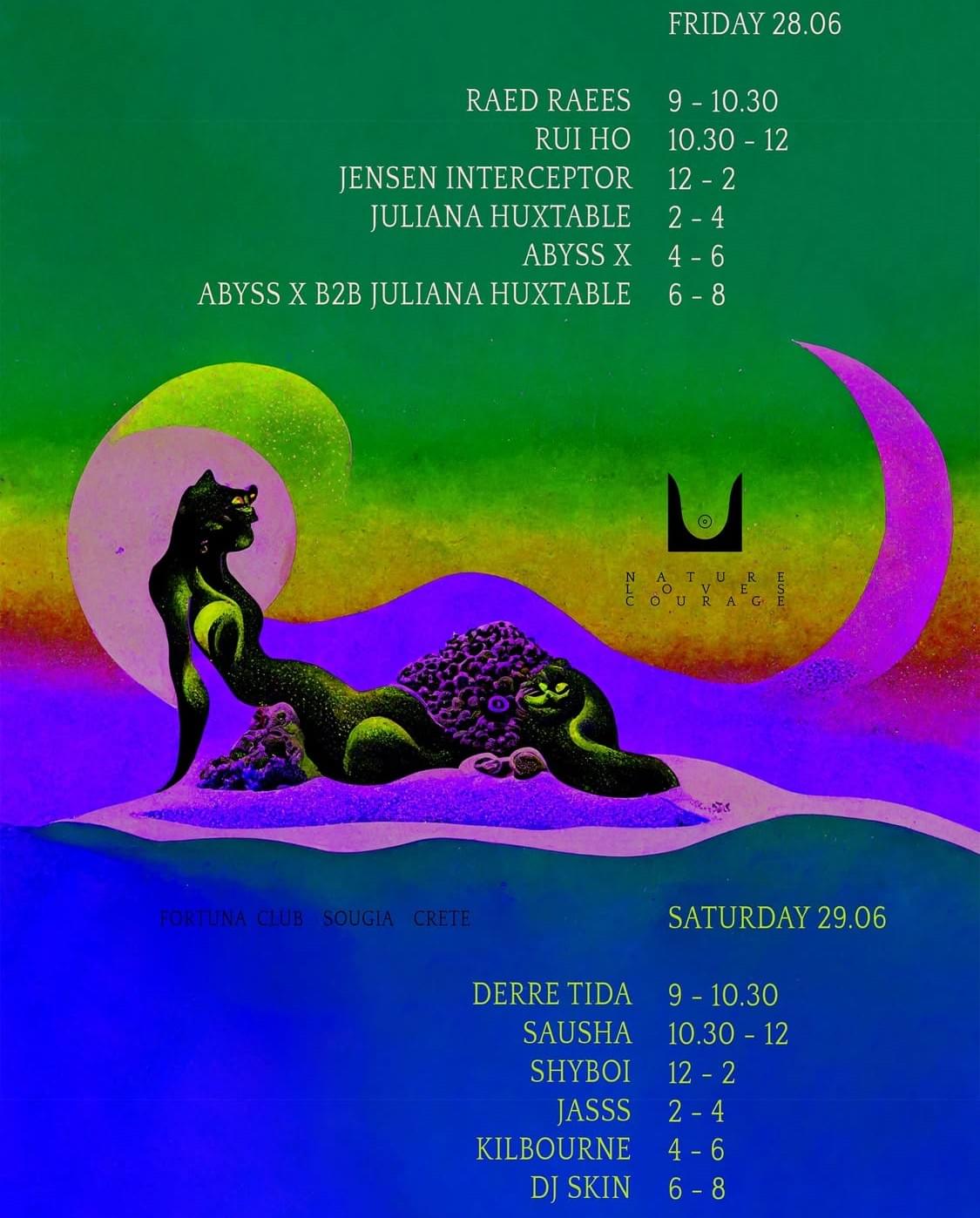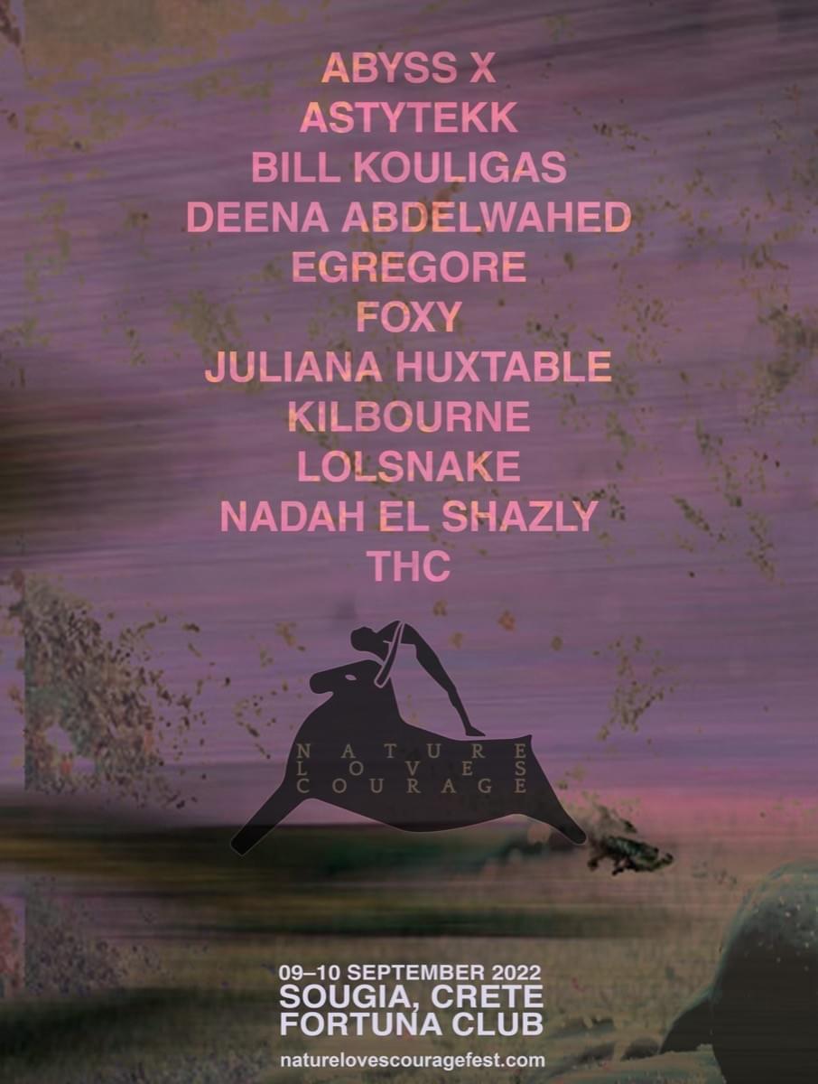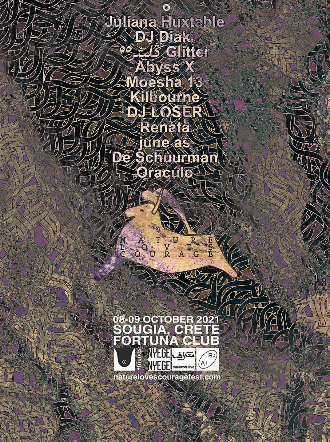 Drawing from the rich, sonic channels of the African and Arab world that run through the tip of Southern Europe where Crete is located, Nature Loves Courage, with the support of Kampala-based collective Nyege Nyege and Radio Al Hara, summonsed the ancient winds resurfacing from the native terrain. Nyege Nyege, a game changer in the electronic music landscape, bringing African-based music excellence to the world, presents some of its artists including DJ Diaki, De Schuurman and Moesha 13 to this idyllic point, alongside Juliana Huxtable, DJ LOSER, Abyss X and more NLC friends.